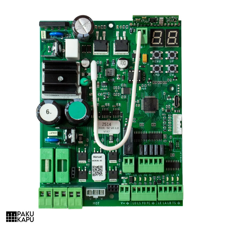 Technikai adatok: lámpa kimenet 36Vdc/4W (max), RGB kimenet 24Vdc/100mA (max), Motor 36Vdc/400W (max), kiegészítőknek: 24Vdc/8W (max), nyomógomb, stop bemenet, külső és belső fotocella bemenet, vezérlő panel mérete 106x140 mm.